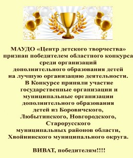 4 декабря состоялась торжественная церемония награждения победителей областного конкурса на лучшую организацию деятельности среди организаций дополнительного образования детей в 2020 году. Центр детского творчества стал лучшей организацией дополнительного образования в Новгородской области. Поздравляем замечательный коллектив Центра детского творчества, обучающихся, родителей и желаем творческих успехов!