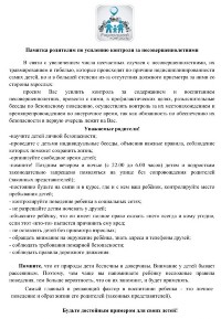 ПАМЯТКА ПРАВИЛА БЕЗОПАСНОГО ПОВЕДЕНИЯ ВО ВРЕМЯ ВЕСЕННИХ ПАВОДКОВ Правила безопасного поведения во время весенних паводков Памятка для учащихся и родителей Зима практически уступила место весне, погода стоит абсолютно нестабильная: утром шёл снег, в обед светило солнце, а по ночам лужи снова замерзают. И не только лужи. Идет весна... Снег оседает под солнечными лучами, становится талым. Но лед на реке все еще кажется крепким. Его покров все еще сковывает воду. Но это лишь на первый взгляд. Лед на реке тоже почувствовал приход весны. Приближается время весеннего паводка. Лед на реках становится рыхлым, "съедается” сверху солнцем, талой водой, а снизу подтачивается течением. Очень опасно по нему ходить: в любой момент может рассыпаться с шипением под ногами и сомкнуться над головой. Опасны в это время канавы, лунки, ведь в них могут быть ловушки –ямы, колодцы. Наибольшую опасность весенний паводок представляет для детей. Оставаясь без присмотра родителей и старших, не зная мер безопасности, так как чувство опасности у ребенка слабее любопытства, играют они на обрывистом берегу, а иногда катаются на льдинах водоема. Кое-кто из подростков умудряется ловить рыбу, находясь на непрочном льду. Такая беспечность порой кончается трагически. Весной нужно усилить контроль над местами игр детей. В этот период ребятам не следует ходить на водоемы. Особенно опасны для жизни глубокие ямы и промоины, которые не всегда огорожены и обозначены предупредительными знаками. | |