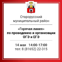 14 мая с 14.00 до 17.00 будет работать горячая линия по вопросам государственной итоговой аттестации в 2021 году. В работе горячей линии примут участие специалисты комитета по образованию администрации Старорусского муниципального района. Телефон: 8 (81652) 2-23-15