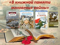 В рамках празднования 79-ой годовщины победы в Великой Отечественной войне 1941-1945 годов в образовательных организациях города и района состоялась литературно-патриотическая акция "А в книжной памяти мгновения войны...", которую проводили школьные библиотечные специалисты. Цель акции - воспитание патриотических чувств у школьников на примере лучших литературных произведений о Великой Отечественной войне. В основе акции - чтение вслух небольших по объёму рассказов, а также отрывков из повестей и романов, рассказывающих о наиболее ярких эпизодах Великой Отечественной войны, героическом подвиге советских людей в битве с врагом. Вот лишь некоторые из них: "А зори здесь тихие..." Б.Васильева,«Судьба человека» М. Шолохова, «Повесть о настоящем человеке» Б. Полевого, "Сын артиллериста" К.Симонова, "Брестская крепость" С.Алексеева, "О мальчике Тишке и отряде немцев" Л.Кассиля, "Рассказ танкиста" А.Твардовского и многие другие. | |